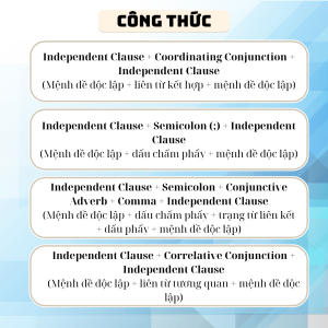 - Các mệnh đề được kết nối bởi liên từ (conjunctions), dấu chấm phẩy (semicolon), hoặc các từ nối khác.