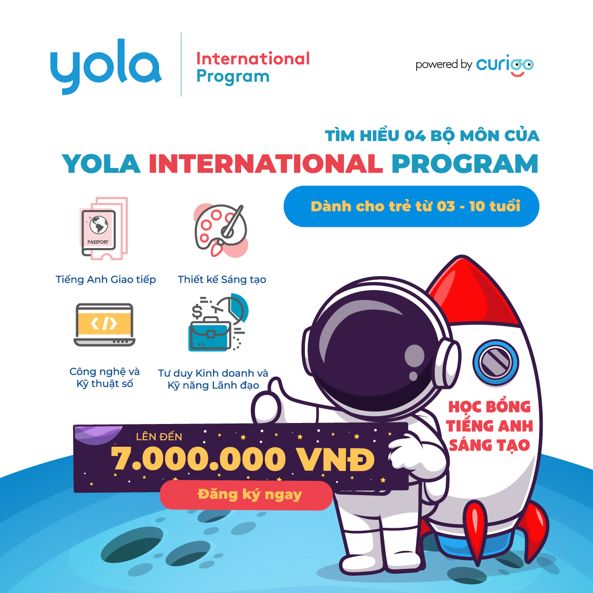💥 Chương trình YOLA International Program (YIP) được thiết kế cho trẻ từ 3 – 10 tuổi. Giảng dạy gồm 4 bộ môn: Tiếng Anh, Thiết kế Sáng tạo, Công nghệ, Tư duy Kinh doanh, tạo điều kiện cho trẻ cảm thấy thú vị và hứng thú khi học tập.