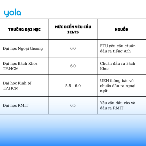 - Xét chuẩn đầu ra ngoại ngữ cho sinh viên: Nhiều trường đại học tại Việt Nam, theo khuyến nghị của Bộ Giáo dục và Đào tạo, đã đưa ra yêu cầu về chứng chỉ ngoại ngữ quốc tế như IELTS nhằm đảm bảo sinh viên sau khi tốt nghiệp đạt được năng lực ngoại ngữ cần thiết để hội nhập trong môi trường làm việc quốc tế. IELTS thường được yêu cầu với mức điểm từ 5.0 – 6.5, tùy theo từng trường và từng chuyên ngành.