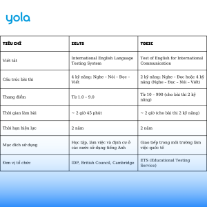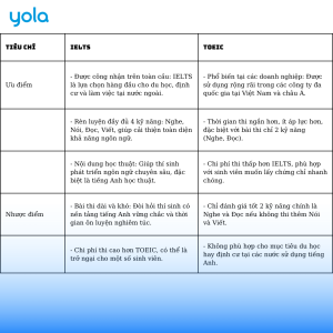 Đối với sinh viên, việc lựa chọn thi IELTS hay TOEIC là một quyết định quan trọng, ảnh hưởng đến cơ hội tốt nghiệp, học tập nâng cao và công việc trong tương lai. Mỗi chứng chỉ có những ưu điểm riêng, phù hợp với từng mục tiêu và yêu cầu khác nhau của các trường đại học cũng như doanh nghiệp. Vậy làm sao để biết khi nào nên thi IELTS và khi nào nên chọn TOEIC? Hãy cùng YOLA tìm hiểu qua bài viết dưới đây.
