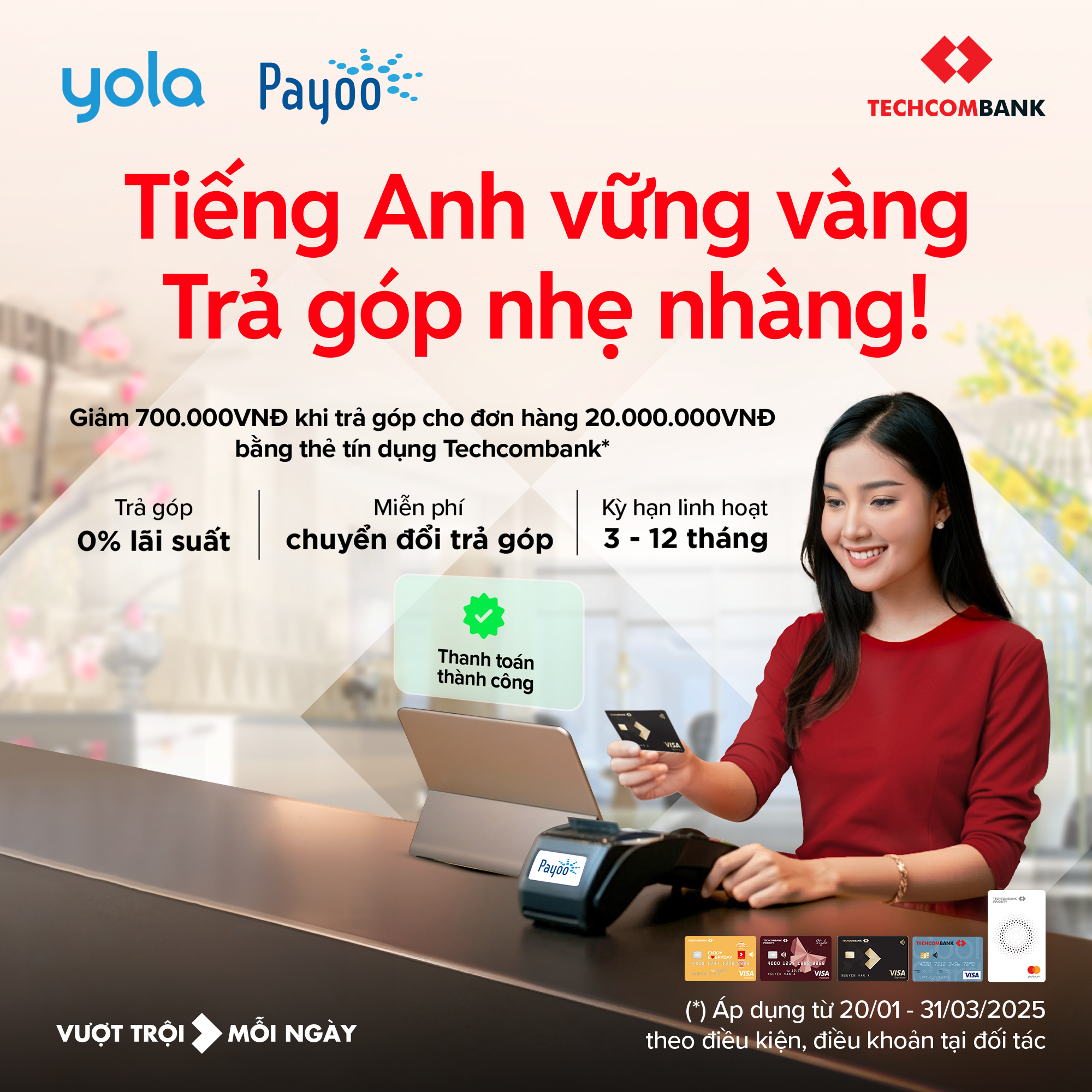 Từ nay đến 31/03/2025, ba mẹ nhận ngay ưu đãi giảm 700K khi trả góp học phí từ 20 triệu đồng tại YOLA bằng thẻ tín dụng Techcombank!