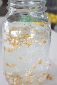 Bước 3: Thêm hạt ngô vào và từ từ đổ giấm. Trẻ sẽ thấy các hạt ngô nổi lên và “nhảy múa” trong nước.