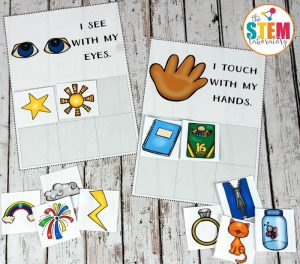 Bước 2: Dùng bộ thẻ giác quan từ The STEM Laboratory để trẻ phân loại vật dụng theo từng giác quan.