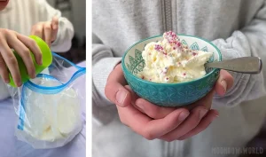 Mang găng tay vào và bắt đầu lắc mạnh túi trong 5–7 phút. Tiếp tục lắc cho đến khi hỗn hợp sữa trở thành kem mịn đông lại.