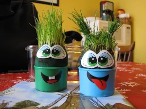 Bước 1: Chuẩn bị hạt giống (như đậu xanh), đất, và chậu nhựa hình người